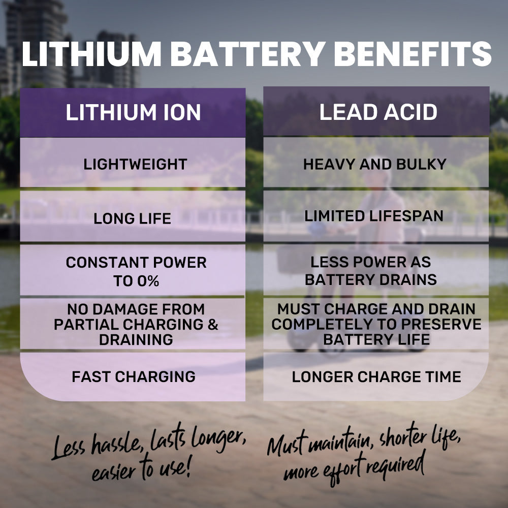 Mid-sized lithium mobility scooter with fast charging. 44.3kg professional build.